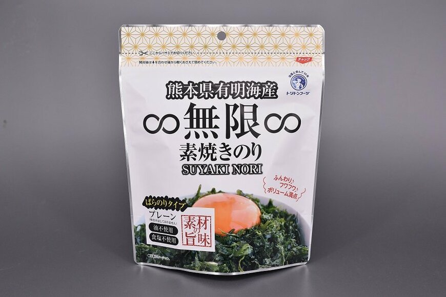 今回は、毎日の食卓に手軽に風味をプラスできる、トリトンフーヅ「∞無限∞素焼きのり」(プレーン)/「∞無限∞やみつきのり」(うま塩味)2種セットを抽選で3名様にプレゼントします。