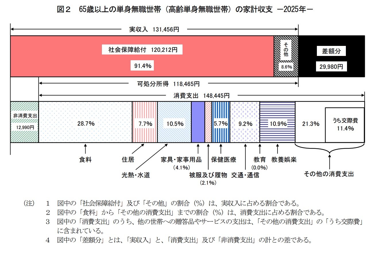 総務省の「家計調査報告 家計収支編 2025年(令和7年)平均結果の概要」によれば、65歳以上の単身無職世帯の家計は次のような状況となっています。