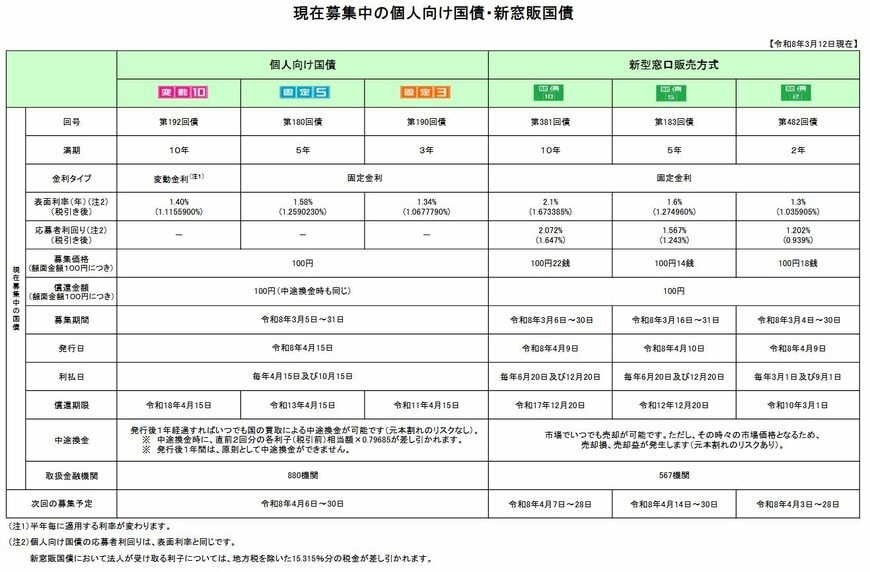 2026年3月募集分(3月5日〜31日)の個人向け国債・新窓販国債の発行条件が公表されました。