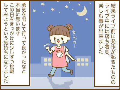 そしてライブが始まり…。ずっと映像でしか観れなかった光景が目の前に広がり、思わず涙するしらたまママさん。結果としては、ライブ前にまた発作は起きてしまったものの、それも乗り切り、その後は、最後まで楽しむことができたそう。「勇気を出して行って良かったなと本当に思います。この日をきっかけに少しずつ挑戦してみようという気持ちになりました。」と話してくれました。