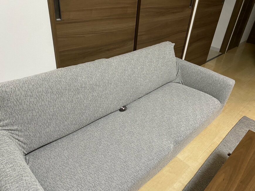 写っているのは、@entachiryouinさんの自宅にあるソファー。大きな灰色のソファーの中央を見ると「黒っぽくて丸い何か」が、ちょこんと落ちているのがわかります。