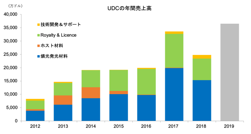 有機EL用燐光発光材料メーカーの米ユニバーサルディスプレイコーポレーション(UDC)は、2019年の通期売上高予想を期初見通しの3,25億~3.5億ドルから3.45億~3.65億ドルに引き上げた。1~3月期の業績が想定を上回ったため。同社は有機ELの生産能力が、インストールベースで19年末に17年末比で5割増加するとみている。有機EL業界では、現在のところ世界で唯一、テレビ用有機ELパネルを製造している韓国のLGディスプレーが7月から中国・広州に新工場を稼働させる予定であり、こうした生産面積の増加が牽引役になる。