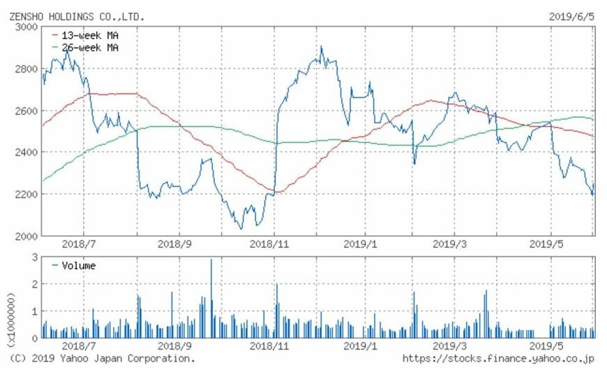 同社株価は、昨年12月7日に2,934円の天井を付けた後に下落。本年2月には2,292円まで落ちこんだ後、いったん反発しましたが再び下落を開始。現在は2,200円前後で取引されています。