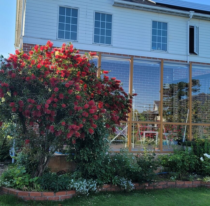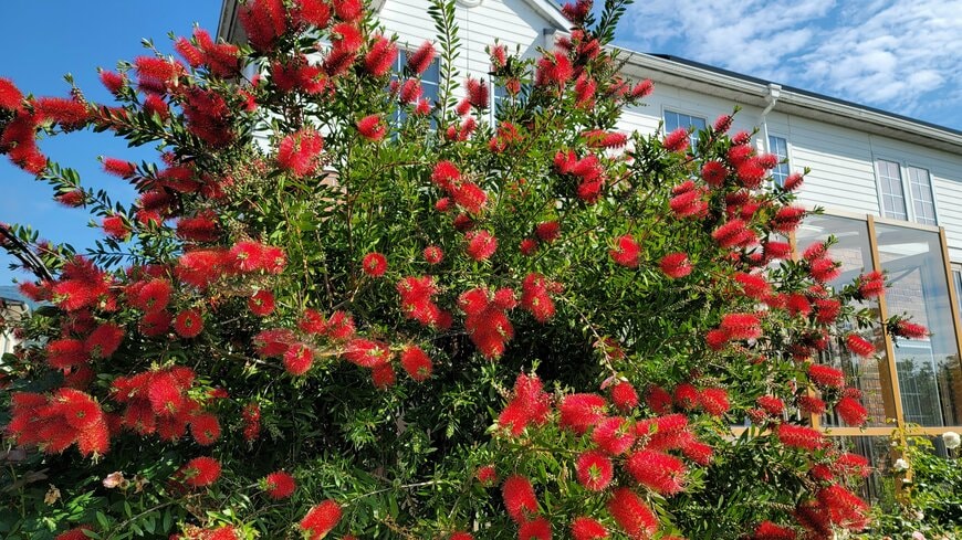 大きくなりすぎず、一年中緑を保ちながら目隠しにもなり、初夏には庭の主役になるほどの情熱的な花を咲かせる、わが家の庭のシンボルツリー〈ブラシノキ〉。