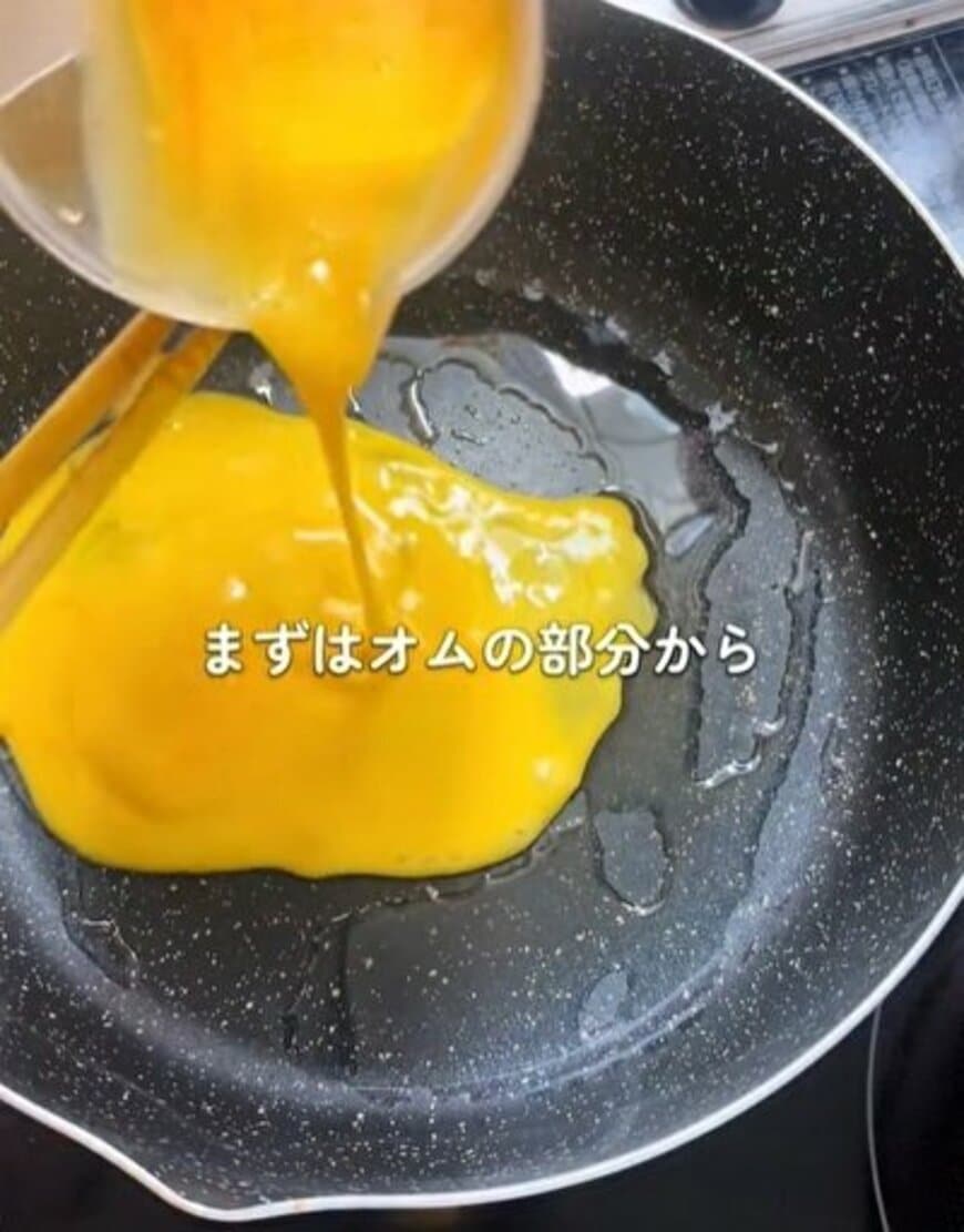 まずは、オムライスの「オム」の部分から作るとのことで、フライパンで薄焼き卵を焼きます。