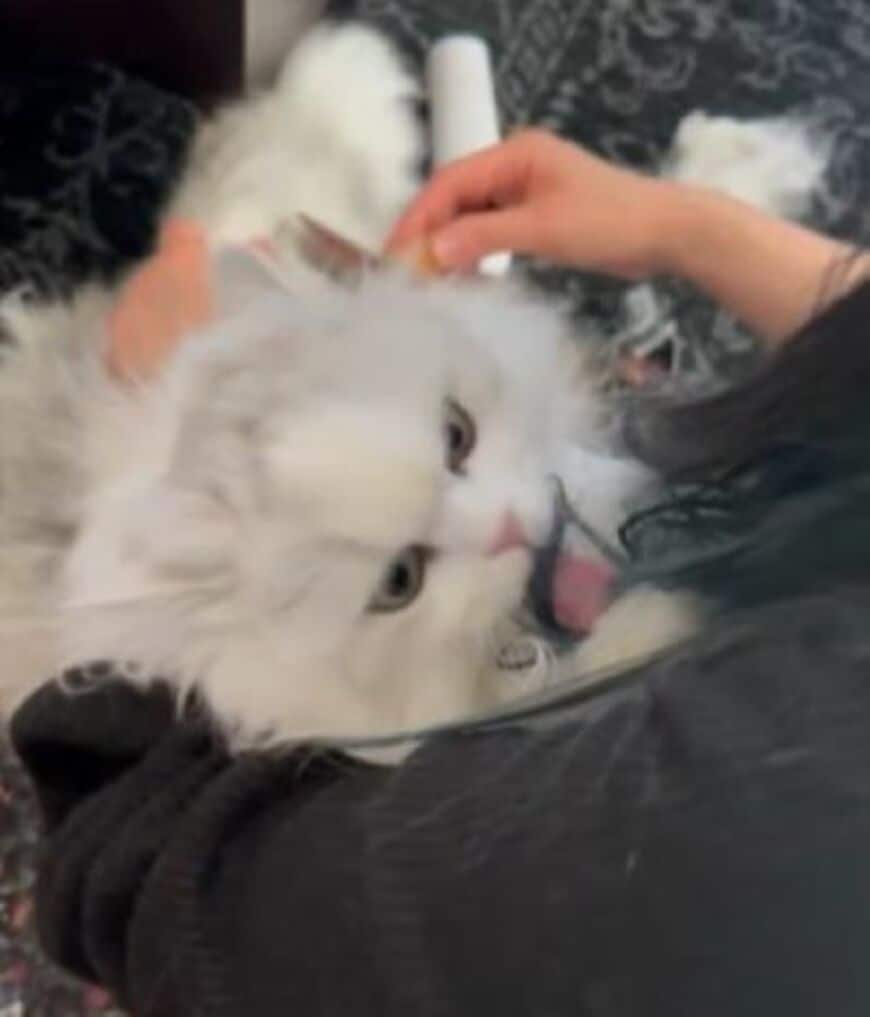 写っているのは、猫の男の子「ノーマン」くんです。大好きなママさんの膝の上で、ブラッシングしてもらっているようですが……。