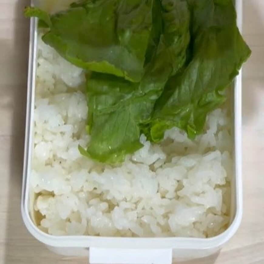 1. 【肉巻ききのこ弁当】ご飯の上に仕切りの野菜を添えて肉巻ききのこを詰める