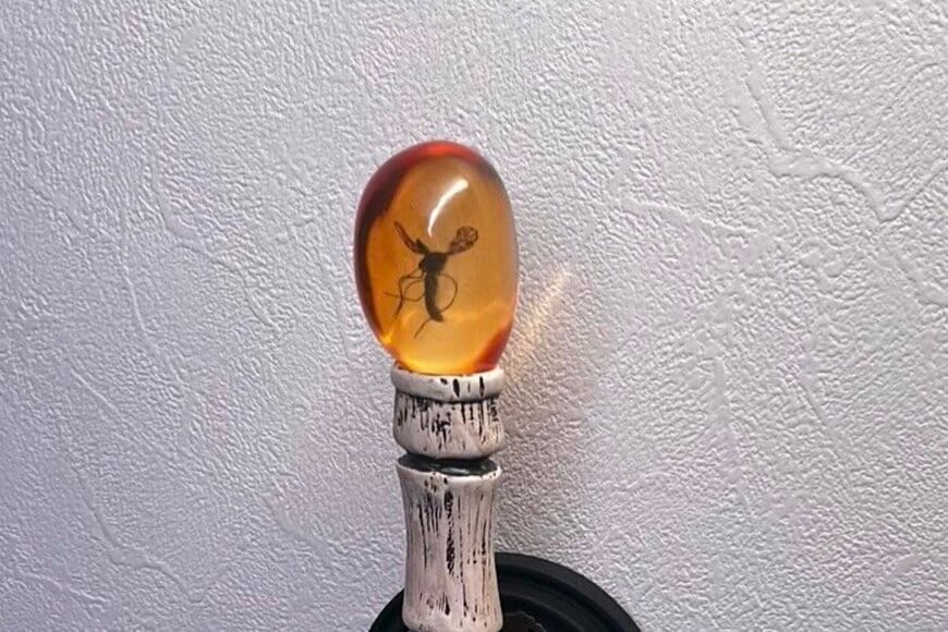 骨のような節のある白い杖の先には、琥珀色の球体が取り付けられており、その中には一匹の虫が閉じ込められています。実はこの杖、映画『ジュラシック・パーク』シリーズに登場するキャラクター、ジョン・ハモンドが持っている杖を再現したもの。
