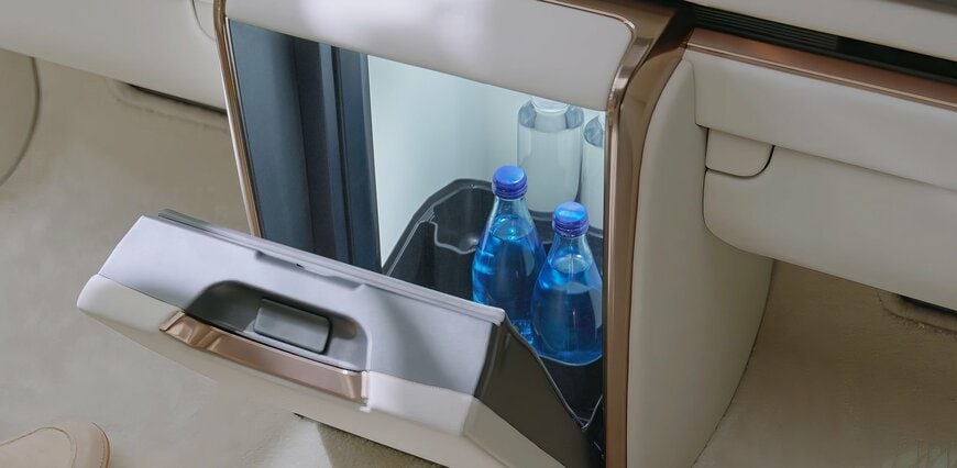 車内の冷蔵庫には、新たに柔軟性のある波型仕切りのホルダーを採用。これは走行中の揺れでボトル同士がぶつかる音を防ぐための設計ですが、サイズの異なる飲み物もスマートに保持できるとのことです。