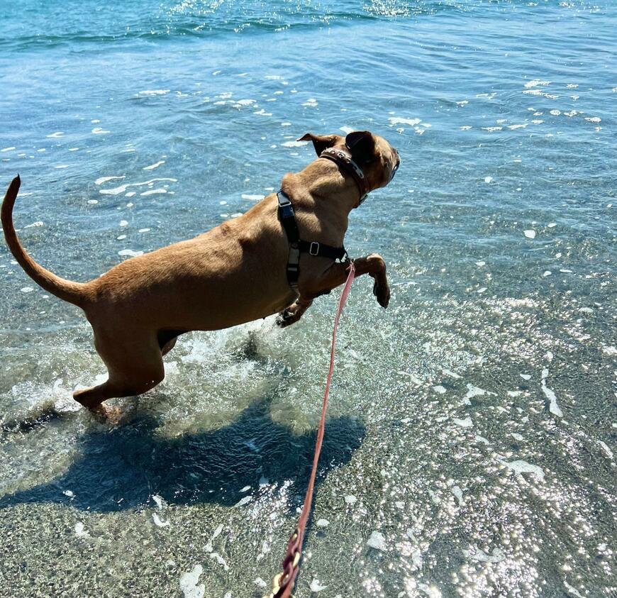 この日は水辺のお散歩を楽しんでいたようで、1枚目には「ウエーイ!」と嬉しそうにはしゃぐ姿がおさめられていました。表情や動きからは充実感が伝わってきますが、その直後…。