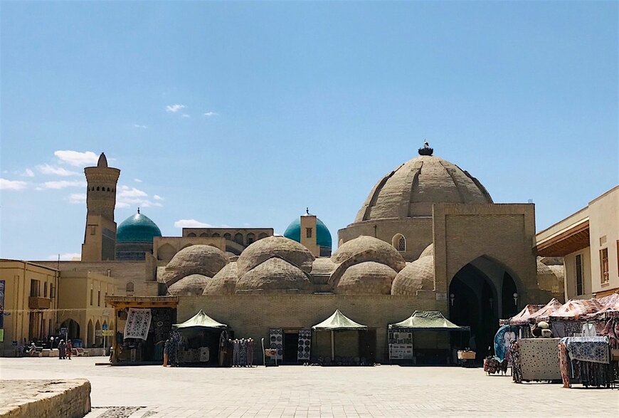 ブハラの観光資源としては、たとえばタキがあります。大通りの交差点に作られたバザールで、カラフルな布地、毛布、陶芸といったシルクロード民芸品が並びます。もともとは関所のような役割も果たしていたそうです。