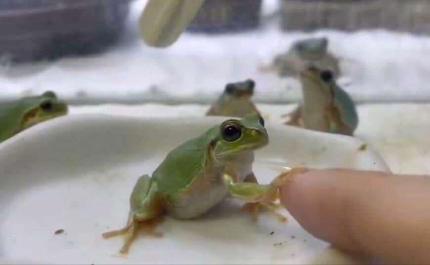 「握手してくれた可愛いー」「って思ったらこれ」そんなコメントとともに投稿されたのは1本の動画。そこに写っていたのは、小さな前足で指にちょこんと触れる、なんとも愛らしいカエルの姿でした。