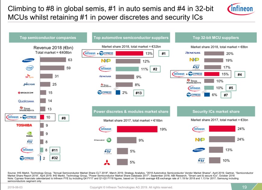 インフィニオンは1株あたり23.85ドルでサイプレスの発行済株式を取得。買収を通じ、コスト削減効果として22年までに1.8億ユーロ、重複が少なく補完性の高い製品ポートフォリオによって、15億ユーロ以上の新たな事業機会創出が見込めるとしている。両社合算の売上高は100億ユーロ(18年度ベース)を超え、半導体業界で世界第8位、車載用半導体、パワーディスクリート、セキュリティーIC分野でともに世界トップになるとしている。