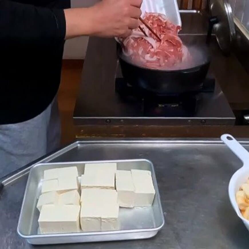 まずは「ぶたすき」に入れる具を準備します。お麩を水につけ、豚こまを下茹でして汚れと余分な脂を取り除き、木綿豆腐はバーナーで焼き豆腐に。