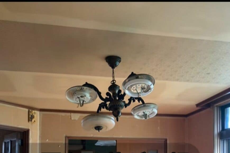 変身前の天井は、レトロな柄の描かれたデザイン。この状態のビフォーが、どんなアフター姿に化けるのでしょうか。