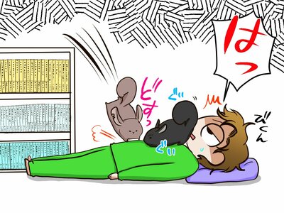 今日は仕事で徹夜をした祭さん。ようやく仕事を終え、日課のチンチラさんたちのお散歩を開始します。しかし、彼らをケージから出してはあげたものの、さすがに身体がきつくて、一緒に遊んであげることができません。「まあ、お部屋の中だしね。」と、走り回る大明神さんと、小明神さんに、「ゴロゴロしているから、適当に遊んでて。」と言い、横になる祭さん。