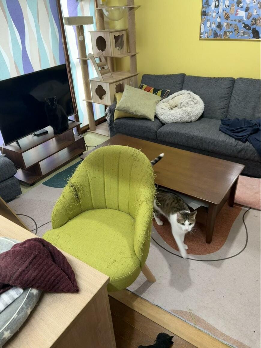 投稿したのは、4匹の猫ちゃんと暮らしている@00shitemitaさんです。写真にはお部屋の様子がおさめられており、この中には「黒猫のコンブくん」の姿もあるとのこと。