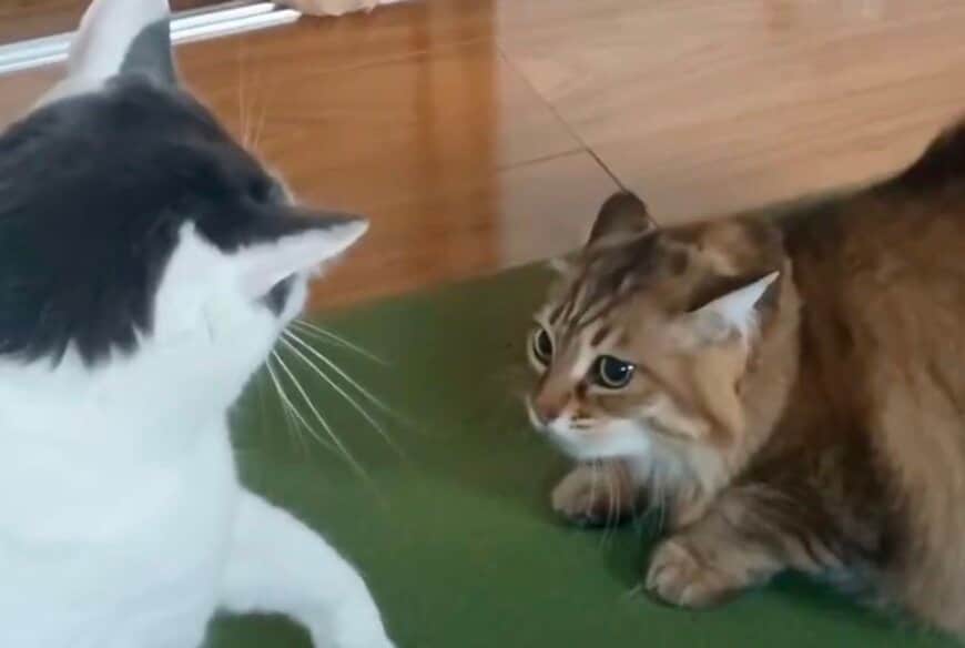 幸くんはまるで麦ちゃんの動きを完全に見切っていたかのように、その頭を上から「ガシッ」と肉球でホールド。麦ちゃんは勢いを完全に奪われ、そのまま地面に押さえ込まれる形で制圧されてしまいます。