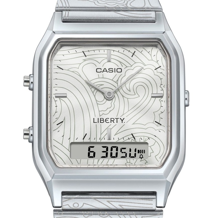 ベースモデルの「AQ-230」は、角型フェイスにアナログ時計とデジタル表示を組み合わせた商品。リバティの代表的なペイズリーファンファーレにインスパイアされ、曲線が美しいクラシックなペイズリー柄をバンドと文字板にデザインしています。