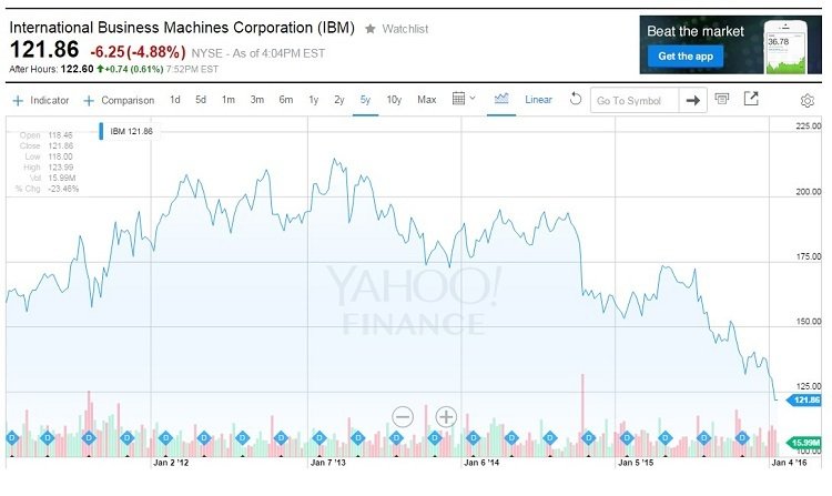 2016年1月20日(現地時間)、米IBMは2015年12月期Q4(10-12月期)決算を発表しました。実績は市場コンセンサスに対して上振れでしたが、発表後の20日の株価は前日比▲4.9%安となり、昨年来安値を更新しました。52週間高値に対しても▲31%の下落となっており、S&P500指数の▲13%に対して大きく見劣りします。