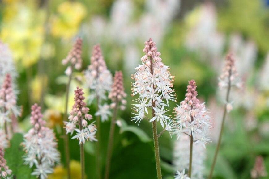 - ティアレラ:線香花火のような繊細な花が庭をふんわりと彩る多年草。