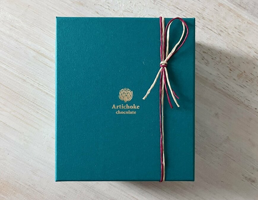 1枚目に写っていたのは、上品で深みのあるグリーンの箱でした。華奢な紐で丁寧に結ばれており、思わず「中身はどんなチョコなんだろう?」と期待が高まります。
