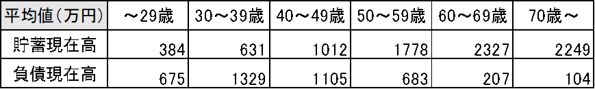 同調査によると、年齢別の貯蓄現在高と負債現在高の平均値は下記のようになっています。