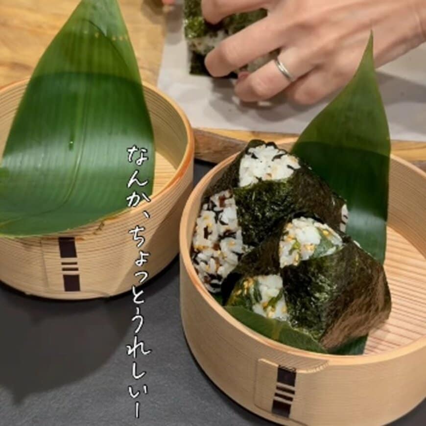 まずはお弁当箱に笹の葉を敷き、おにぎりを作っていきます。おにぎりは、かぶの葉とおかか・ひじきと生姜ふりかけの2種類です。