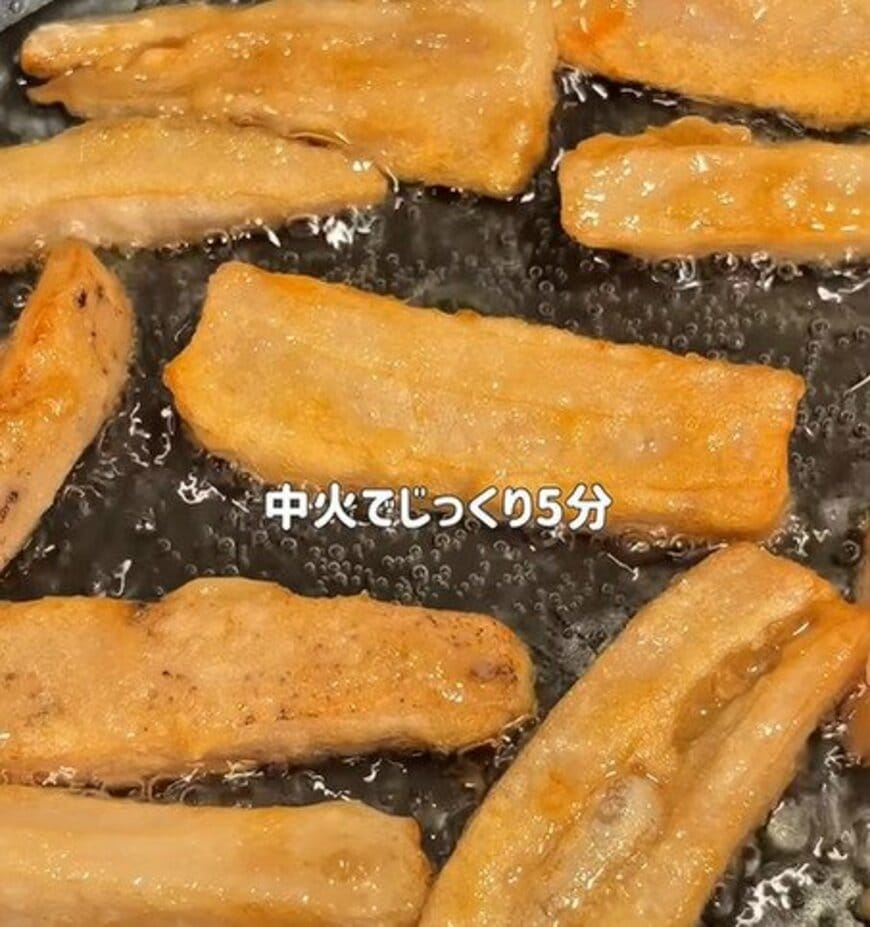 中火でじっくり5分、フライパンで揚げ焼きにします。こんがりしたら取り出して、青のりと塩で味をつけました。