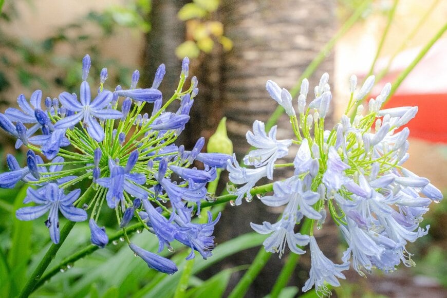梅雨時期にすっと伸びた茎の先に大きな花を咲かせるアガパンサス。青紫や白い花が雨に濡れながらも凛と咲き、じめじめした空気に爽やかさを添えます。