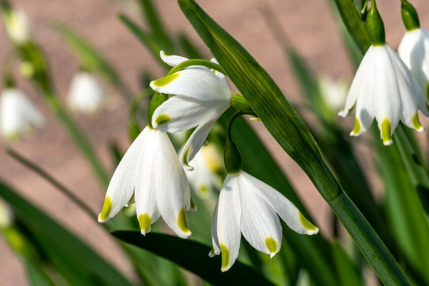 スズランによく似た、純白のベル型の花をうつむき加減に咲かせるスノーフレーク。花びらの先端にちょこんと入る緑色の斑点がアクセントとなり、繊細でスタイリッシュな雰囲気を漂わせます。