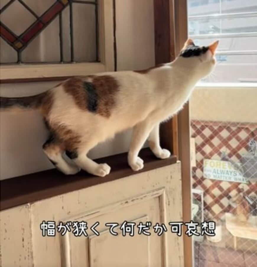 変身前の棚の上は、もともとはアンティークな雑貨を飾る棚として使用されていましたが、猫ちゃんが来てからは雑貨を撤去し、外を眺める場所として定着していました。