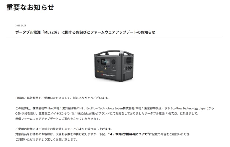 株式会社Willbeは、2026年4月1日、ポータブル電源「ML720i 」の自主回収を発表しました。対象商品とリコールの詳細を紹介します。