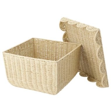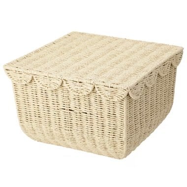 スカラップ状の縁がアクセントの、ナチュラルな雰囲気の蓋付きバスケットです。編み込みのやさしい風合いで、デスクや棚まわりに温かみを添えながら物をすっきり収納できます。