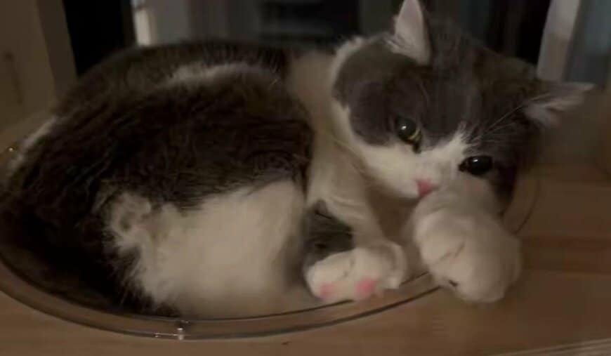 キャットタワーに備え付けられた透明なボウルにすっぽりと収まり、静かにくつろいでいます。