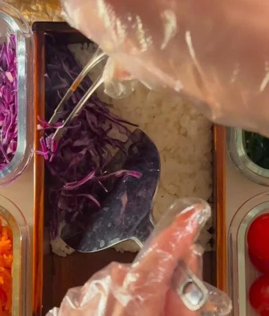 ご飯に目印をつけたら、ヘラを使って具をのせていきます。