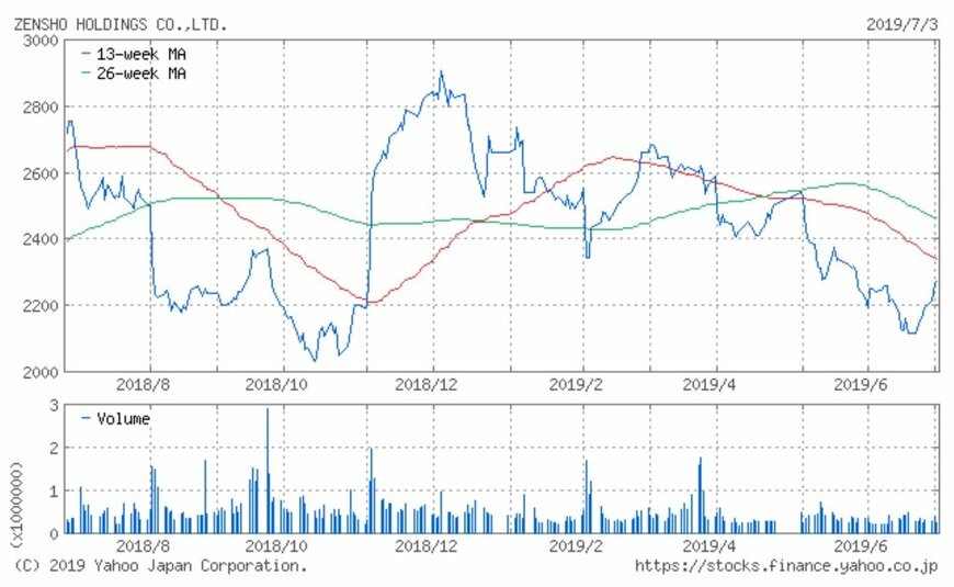 同社株価は、昨年12月7日に2,934円の天井を付けた後に下落を開始。下落が続く中で、6月24日の2,095円を底値にいったん反発しています。