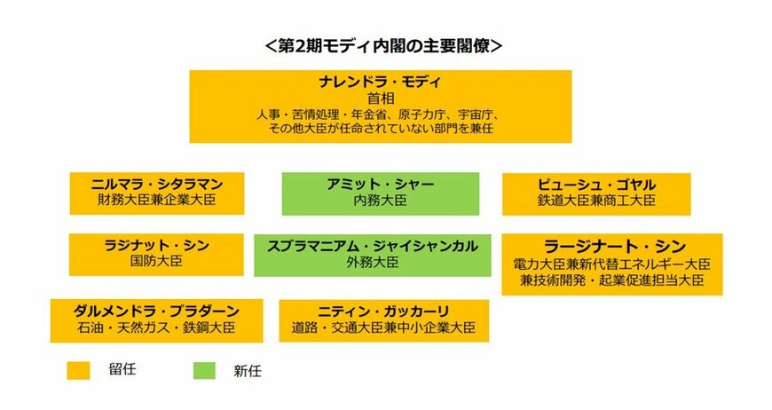 総選挙で勝利を収めたモディ首相は第2期内閣を発足させたが、閣僚の顔ぶれは 1期目から続く課題と選挙公約の実現への取り組みを優先するものとなった。初入閣やポストの入れ替えは少数にとどまり、大きなサプライズ人事もなかった。基本的にはベテランと若手のバランスが取れた内閣と言えるだろう。