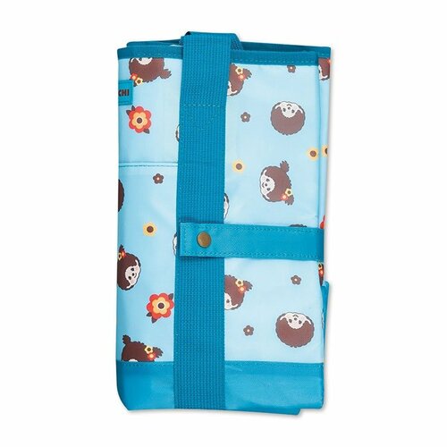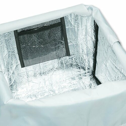 内側には保冷剤を入れられるメッシュポケットを備えています。また、折りたたみ時はボタンでコンパクトにまとめられるので、持ち運びにも便利です。