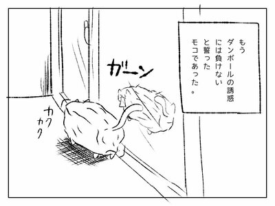 モコは吸い寄せられるように段ボールに近づき、仰向けに入ってみます。スッポリと段ボールにおさまるモコ。…ああ、思った通り、すごくちょうどいい…。が、あれ、でられない!?