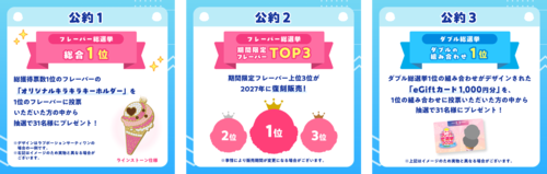 - 参加方法:特設サイトにアクセスの上、お好きなフレーバーを1コ選択し「フレーバー総選挙」へ投票。「フレーバー総選挙」へ投票後、続けて「ダブル総選挙」への投票が可能となります。「ダブル総選挙」では、お好きなフレーバーを2コ選択して投票してください。