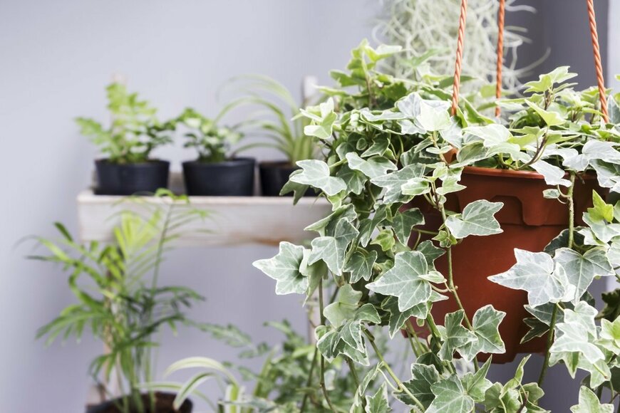 寄せ植えに動きと立体感を出したいときに欠かせないのが、常緑つる性植物のアイビーです。鉢の縁から自然に枝垂れるように配置することで、全体のバランスが良くなり、こなれた雰囲気を演出できます。