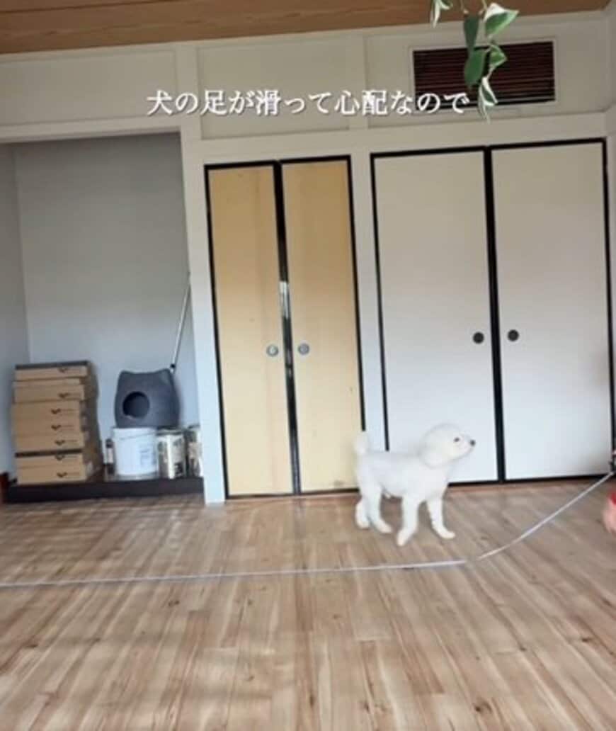 DIYテクニックを発信しているInstagramerが、築30年戸建の和室を、愛犬の足腰に優しいタイルカーペットの床へと大変身させて、「ふわふわさん達よかったね」と話題になっています。