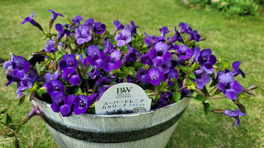 驚くほどの繁殖力で鉢からあふれるように咲き誇る「スーパートレニア カタリーナ」(PW)です。