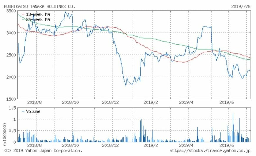 同社株価は、2017年11月末の7,000円台の高値を天井に下落を開始しました。2019年1月4日に1,787円の安値を付けた後に反転し、4月末には3,000円台を回復しています。しかしその後再び下落に転じ、6月以降は2,000円付近での取引が行われています。