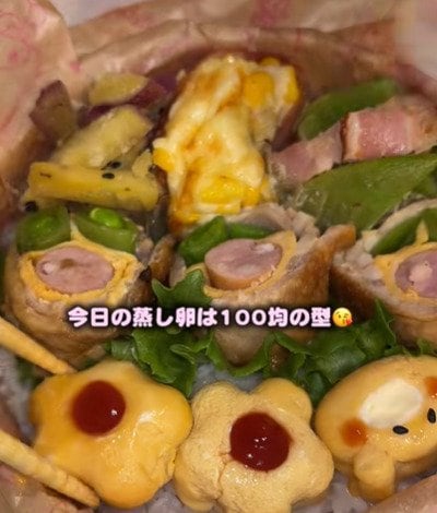 100均の型で作ったお花の蒸し卵なども詰めます。