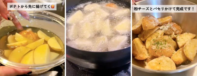 柔らかくしたじゃがいもに塩と片栗粉を塗し、油で揚げたら粉チーズとパセリをかけて完成です。