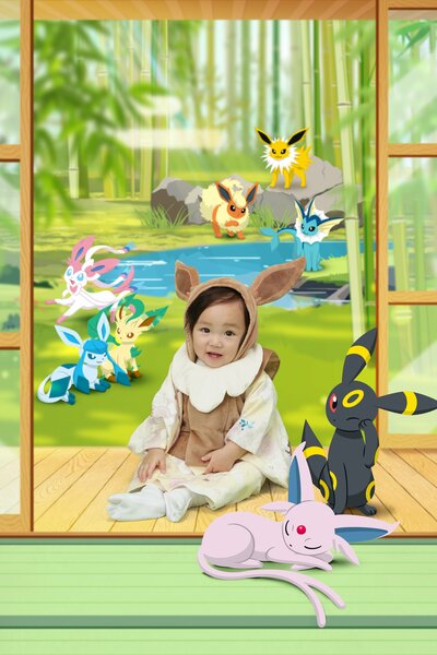 1歳一つ身衣装に合わせたパステルな色味が基調のイーブイの進化形ポケモンのシルエットや和柄アイコン、モンスターボールをちりばめた背景。