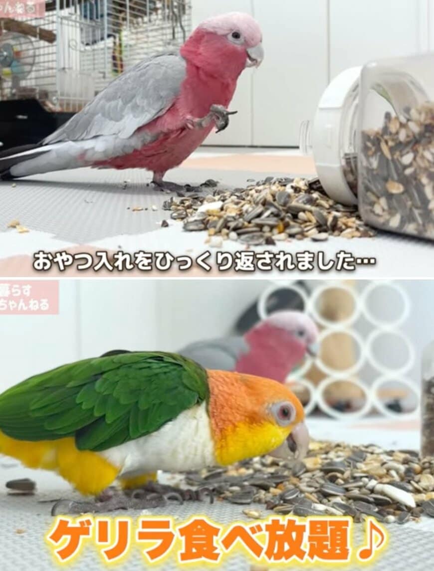 投稿に映っているのは、モモイロインコの「みりん」ちゃんとシロハラインコの「とろろ」ちゃん。@anz_omomiriさんが油断した隙に、みりんちゃんがおやつ入れをひっくり返してしまったのだそう。