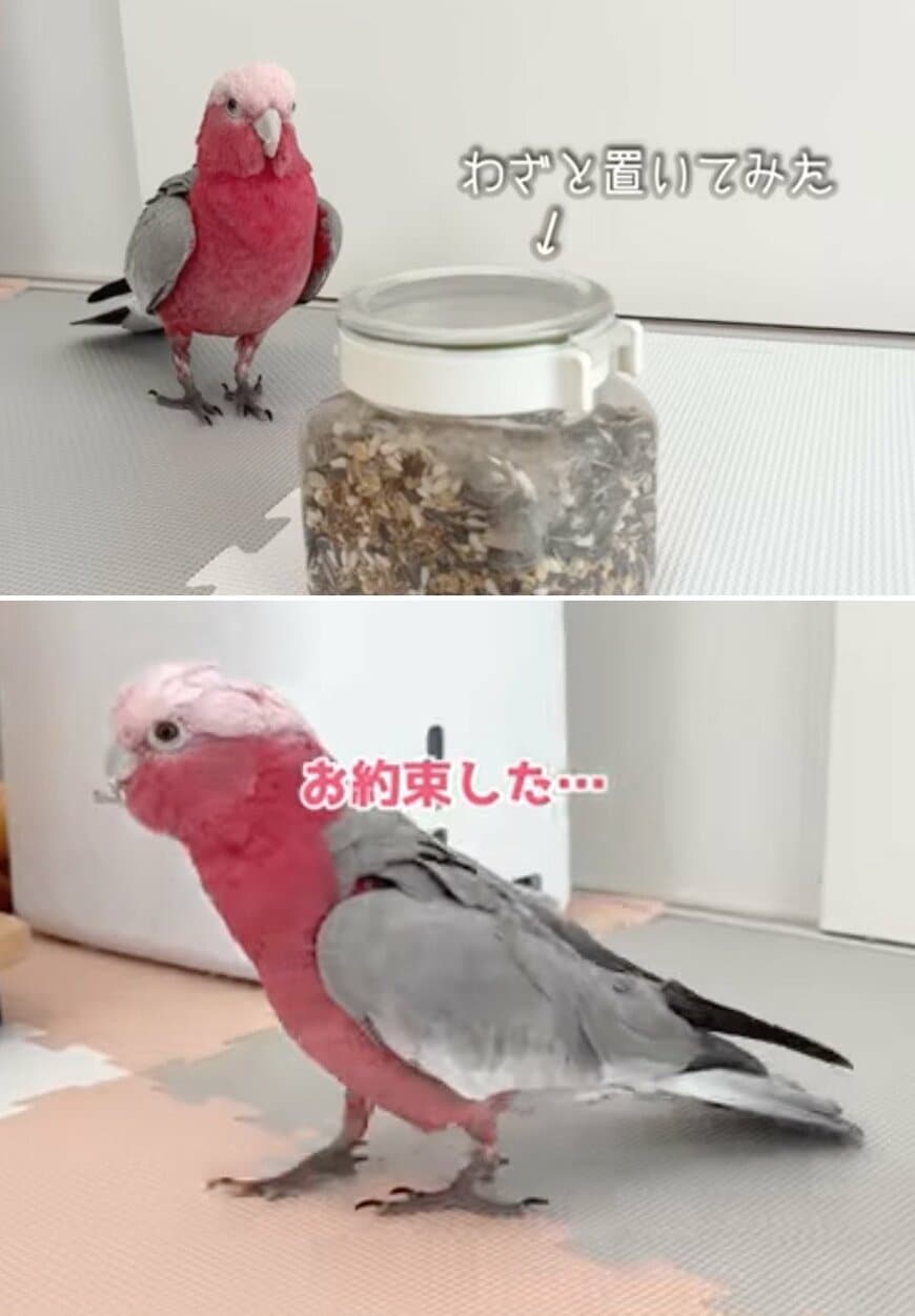 みりんちゃんの前にわざとおやつ入れを置いてみると…みりんちゃんはイタズラせずに遠ざかりました。@anz_omomiriさんの言うことをしっかり聞いているようで、とてもエラいですね。